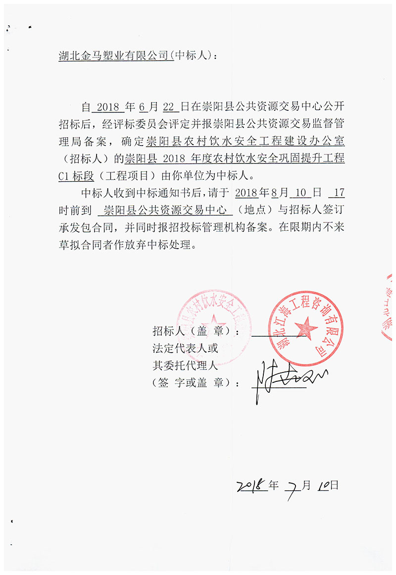 鄂州祝賀金馬塑業(yè)中標(biāo)崇陽(yáng)縣2018年度農(nóng)村飲水安全鞏固提升工程